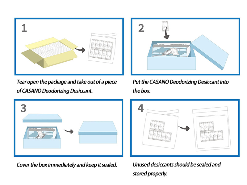 · CASANO Deodorizing Desiccant are commonly used inside shoe and clothing packaging. They effectively adsorb volatile organic compounds (VOCs) in the environment, demonstrating excellent removal capabilities for harmful substances and odors in the air, including benzene compounds (dibenzene, triphenyl), formaldehyde, phenol, ammonia, and others.